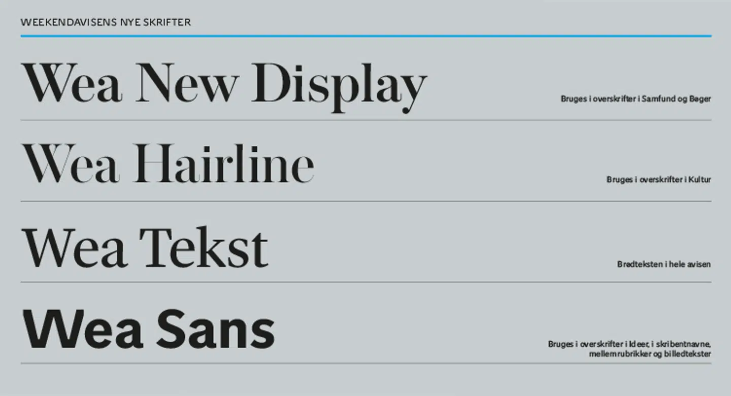 Avisens nye infoskrift til billedtekster, ledeord og mellem­rubrikker hedder Wea Sans. Den er inspireret af Knud V. Engelhardts smukke skilteskrifter fra 1920rne, og den er en fin og moderne partner til de mere klassiske overskrifter.