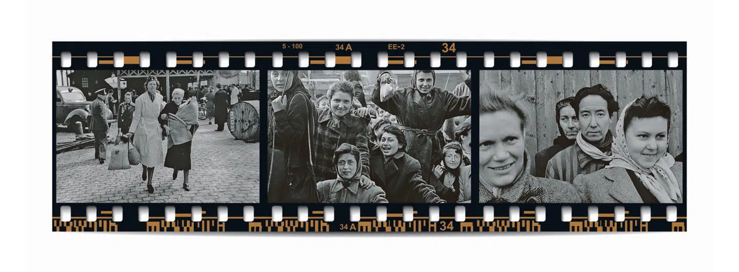 Magnus Gerttens dokumentartrilogi tager udgangspunkt i en filmoptagelse fra havnen i Malmø, hvor holocaustoverlevere ankom 28. april 1945. Trilogien udgøres af Hoppets hamn fra 2011 (tv.), Varje ansikte har ett namn fra 2015 (mf.) og Nelly & Nadine fra i år (th.), hvori instruktøren forsøger at identificere menneskene på den oprindelige filmoptagelse. Collage: Liv Ajse. Originalfotos: Auto Images, Filmbazar