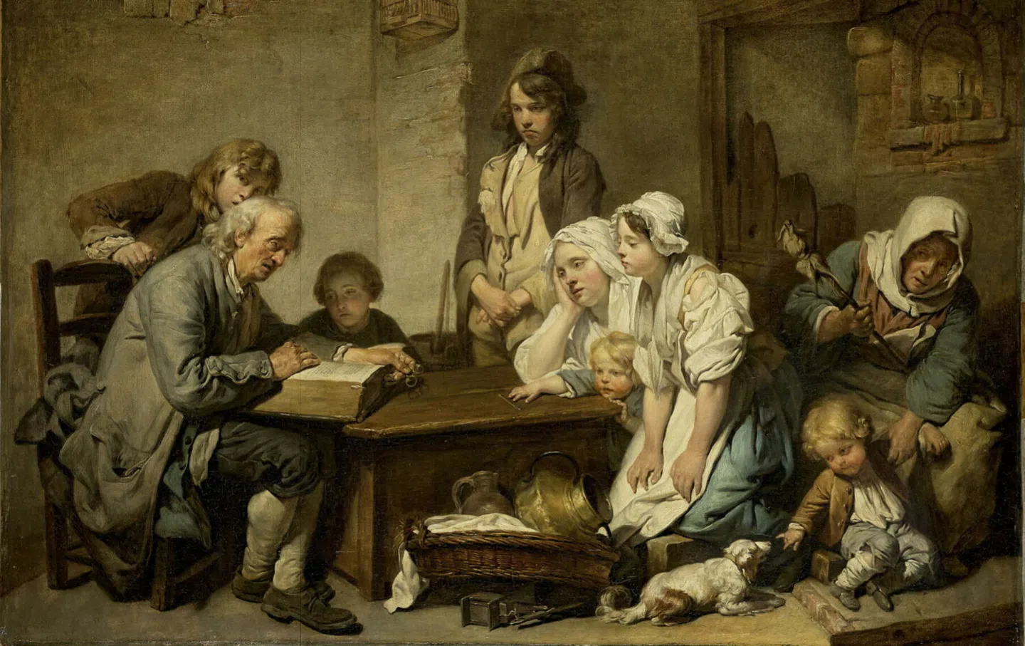 Maleri: Jean-Baptiste Greuze, Un père de famille qui lit la Bible à ses enfants, 1755