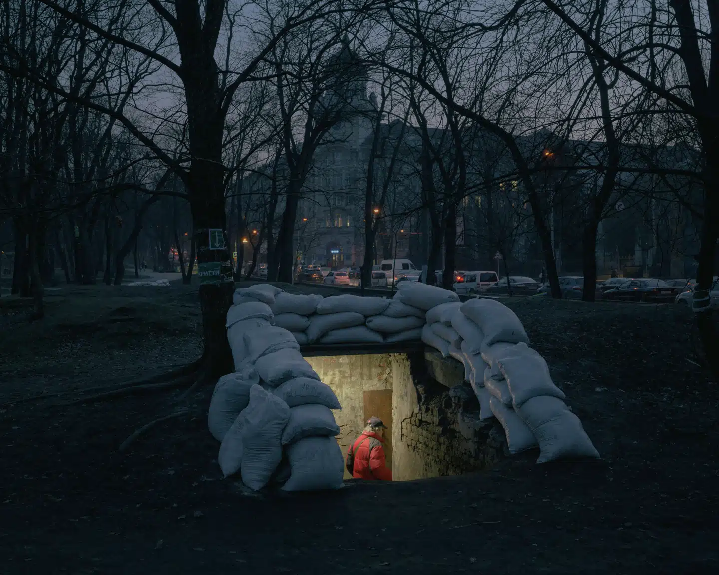 En mand går ind i beskyttelsesrummet i Ivan Franko-parken i Lviv om aftenen den 15. marts. Foto: Ingmar Björn Nolting og Fabian Ritter