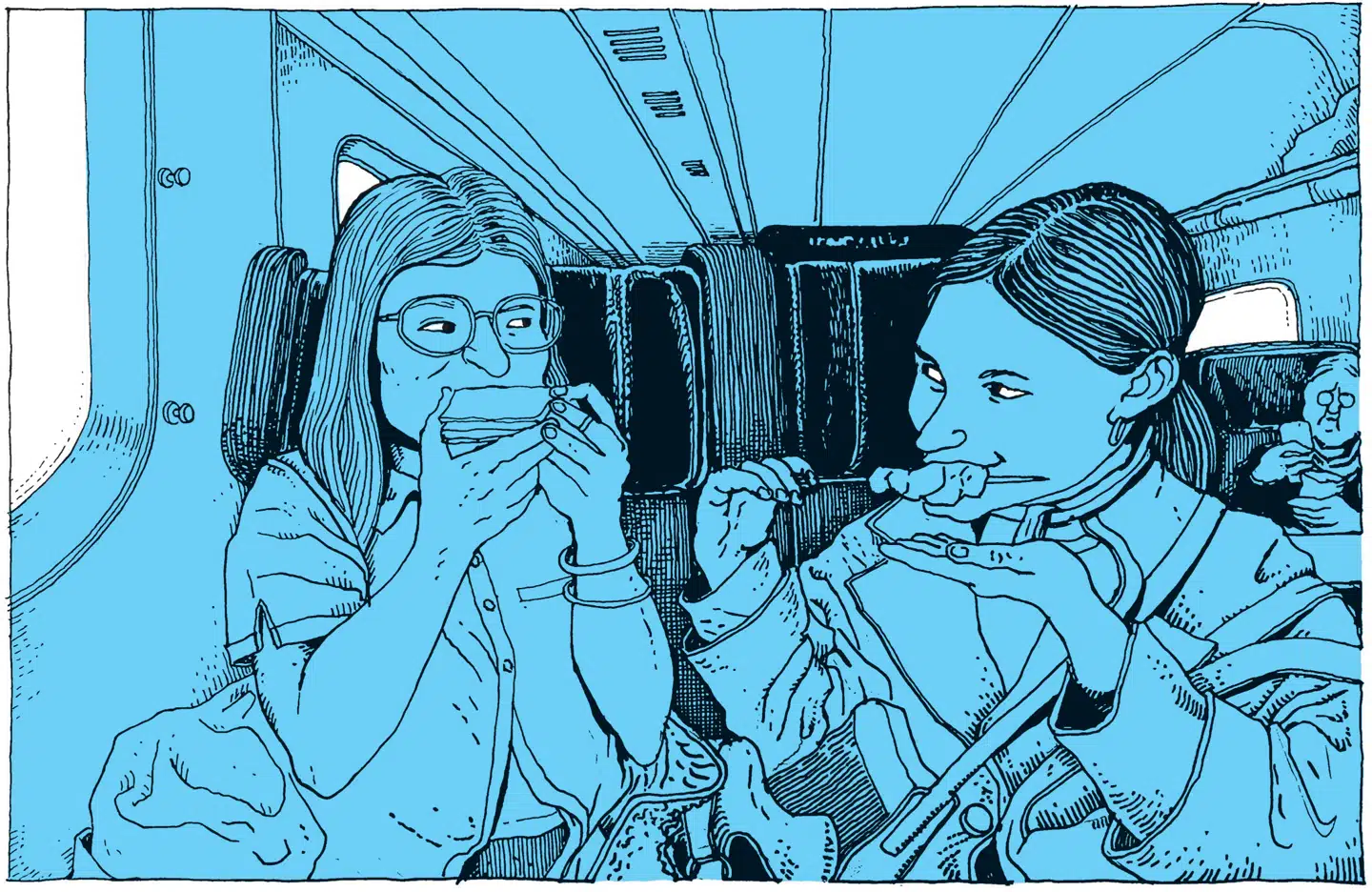 I Aarhus stiger to unge kvinder på toget. De gnasker pinde med kylling fra 7-Eleven og giver Weekendavisens udsendte lov til at tegne dem. Illustration: Christofer Zieler Christofer Zieler