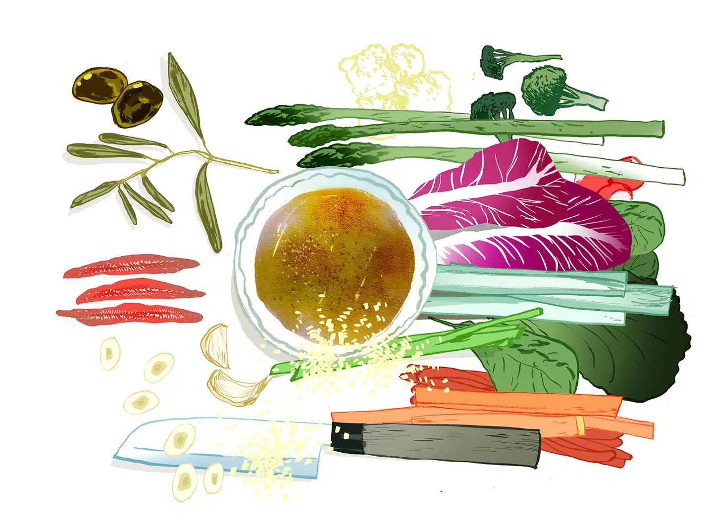 Normalt skal vi gemme det gode pastavand til at hjælpe en sovs med at finde sig selv, men lige i tilfældet pastasalat er det om at begrænse stivelsen, så det ikke bliver en koaguleret omgang. Skyl pastaerne i koldt vand i dørslaget, selvom det føles naturstridigt, og vend dem med lidt olivenolie, så de ikke klumper sammen. Smag til, at de er salte nok, og husk, at kolde retter behøver lidt ekstra skub på salt, syre og sødme.