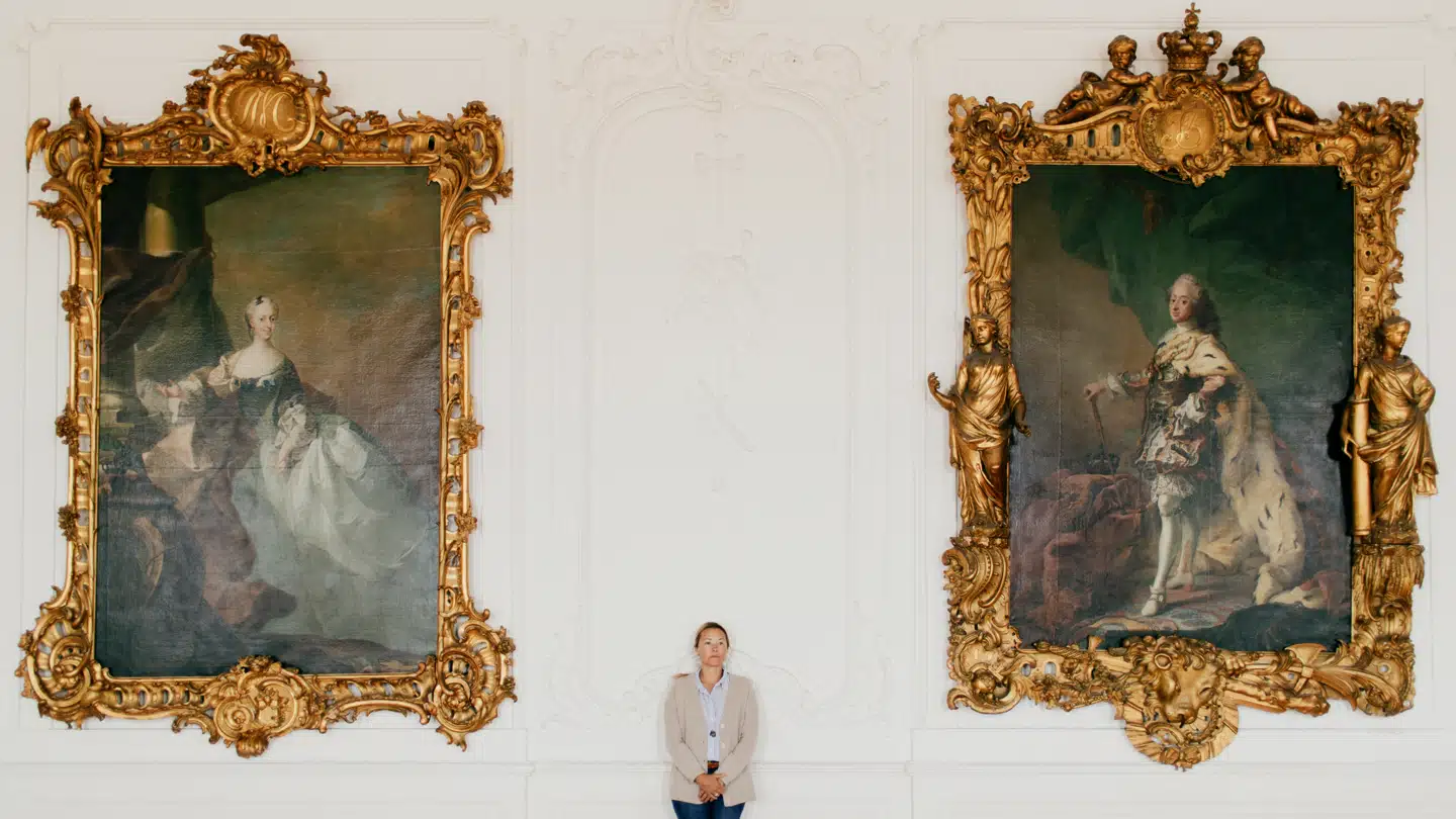 »For mange mennesker vil et familiealbum med fotos være det vigtigste at redde ud, hvis huset brænder. Her har familiealbummet hængt i stor størrelse på væggene, og de er personificeringen af historien om Valdemars Slot,« siger hun, mens hun viser rundt i det tomt rungende slot: »Som barn var jeg faktisk bange for at gå alene gennem denne her gang, fordi mændene på væggen så virkelig store og bryske ud. Alligevel går jeg nu og tænker over, hvem der mon kan finde på at købe min familie på auktion. Det er en mærkelig oplevelse, og det er også mærkeligt, at billederne ikke er her længere. Jeg har jo kigget på dem hele mit liv og har et forhold til dem.«