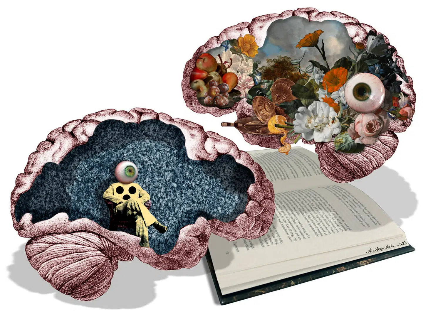 Min hjerne er befolket af en kæmpe flok. De er klædt i hvide kitler og ligner grangivelig sygeplejersker. I alle former og faconer. Nogle er tykke om livet, andre er tårnhøje og magre, med og uden briller. De er, som var de tegnet af Gitte Skov, karikaturer af sig selv. Der er gamle og unge sygeplejersker, sure og søde, og de kører ofte rundt med skramlende metalborde og madvogne, nøjagtigt som på et hospital, alt imens de diskuterer:
