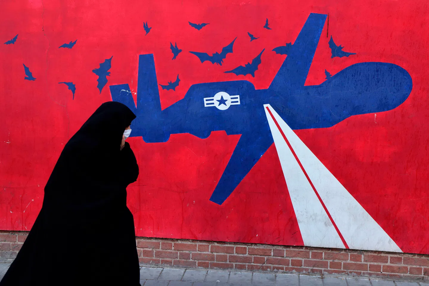 Afsah anslår, at cirka en femtedel af den iranske befolkning kan betegnes som ekstremt loyale tilhængere af præstestyret. På fotoet passerer en kvinde den tidligere amerikanske ambassade i Teheran. På ydermuren er malet en amerikansk drone. Foto: Atta Kenare, Scanpix