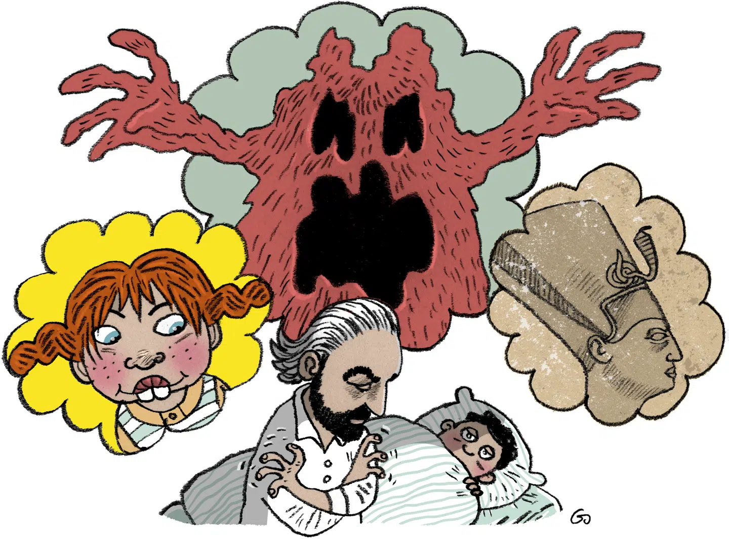 »Well,« hvisler jeg til mig selv, »vi nåede ikke popcorn, fordi du liiige skulle bruge 30-35 minutter på at græde over den rosin, der sad forkert i tebollen, over måden, balletskørtet havde klumpet sig sammen i flyverdragten.« Og derefter nægtede hun at gå forbi »de sure mænd« (Ludvig Holberg og Adam Oehlenschläger), der sidder udhugget i sten på hver side af indgangen til Gamle Scene.
