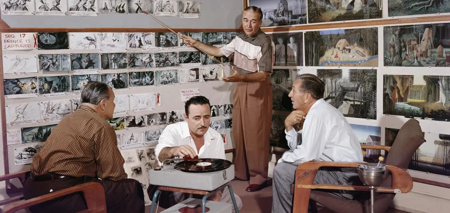 Virksomhedsatmosfære i 1950erne: Walt Disney (til højre) lytter til en af koncernens animatorer, der gennemgår storyboardet til tegnefilmen Tornerose, mens den berømte animator Lee Clark sætter en plade på grammofonen. Foto: Gene Lester, Getty Images Gene Lester, Getty Images