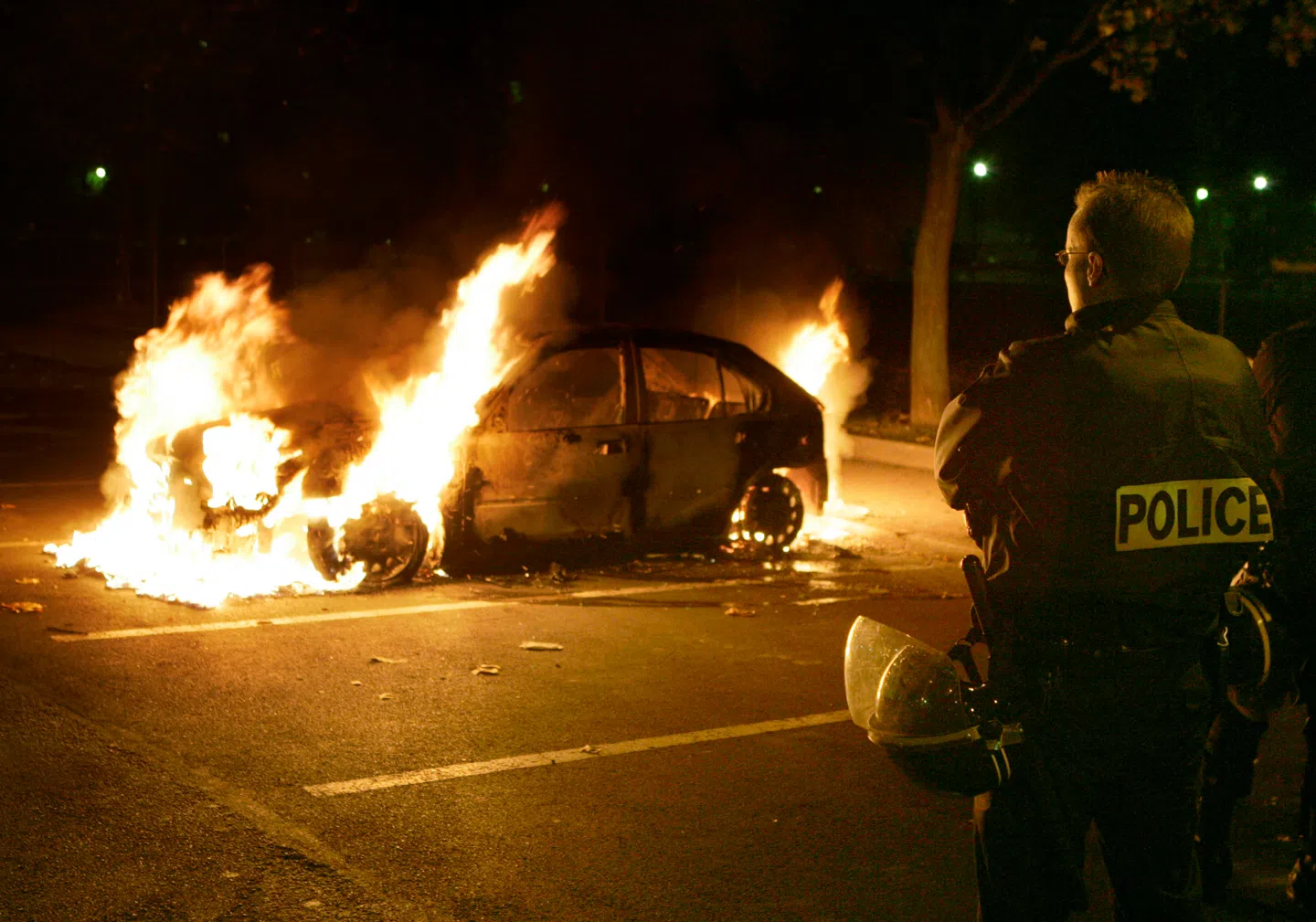 En politibetjent ser på en brændende bil i Aulnay-sous-Bois nord for Paris 5. november 2005. Det år blev det franske samfund ramt af den værste vold i årtier, da der udbrød voldsomme optøjer i de indvandrertunge forstæder. Foto: AFP/Christophe Simon