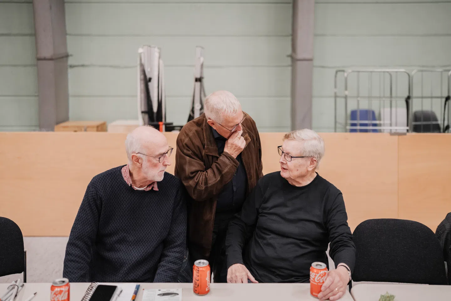 Tre herrer får sig en drøftelse under kaffepausen. Den lokale modstand mod byrådets planer for idrætshallen vokser. Foto: Michael Drost-Hansen