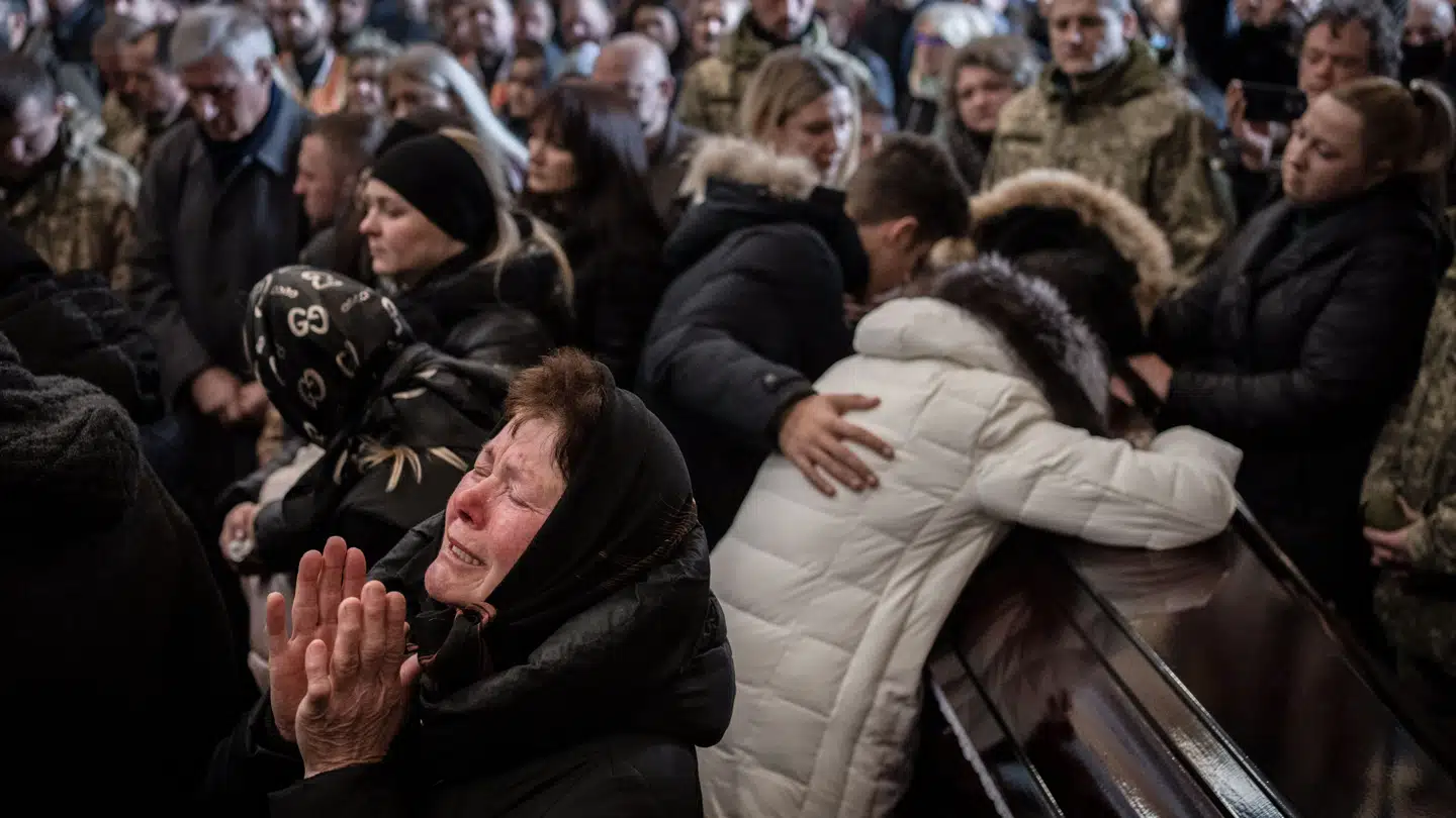 Pårørende deltager i en mindehøjtidelighed for en dræbt ukrainsk soldat i Lviv, Ukraine. Foto: Bernat Armangue, AP/Scanpix