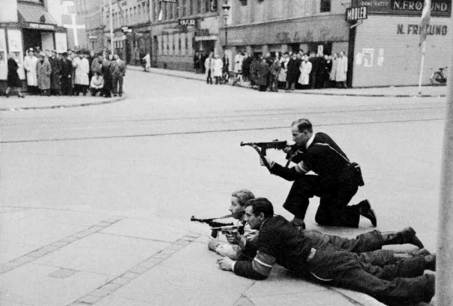 Frihedskæmpere i kamp med tyskerhåndlangere i København. Tage Christensen/Ritzau Scanpix