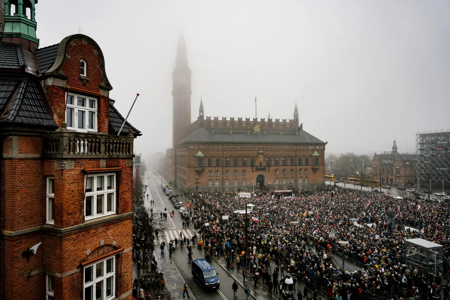 En svalende tåge hænger over Københavns Rådhus lørdag eftermiddag, hvor Dannebrog og det grønlandske Erfalasorput vajer side om side. På Rådhuspladsen har titusindvis af hueklædte borgere forsamlet sig i et overvældende broget hav – høj som lav, pelsfrakker som partisantørklæder i én stor, frysende protestmasse.
