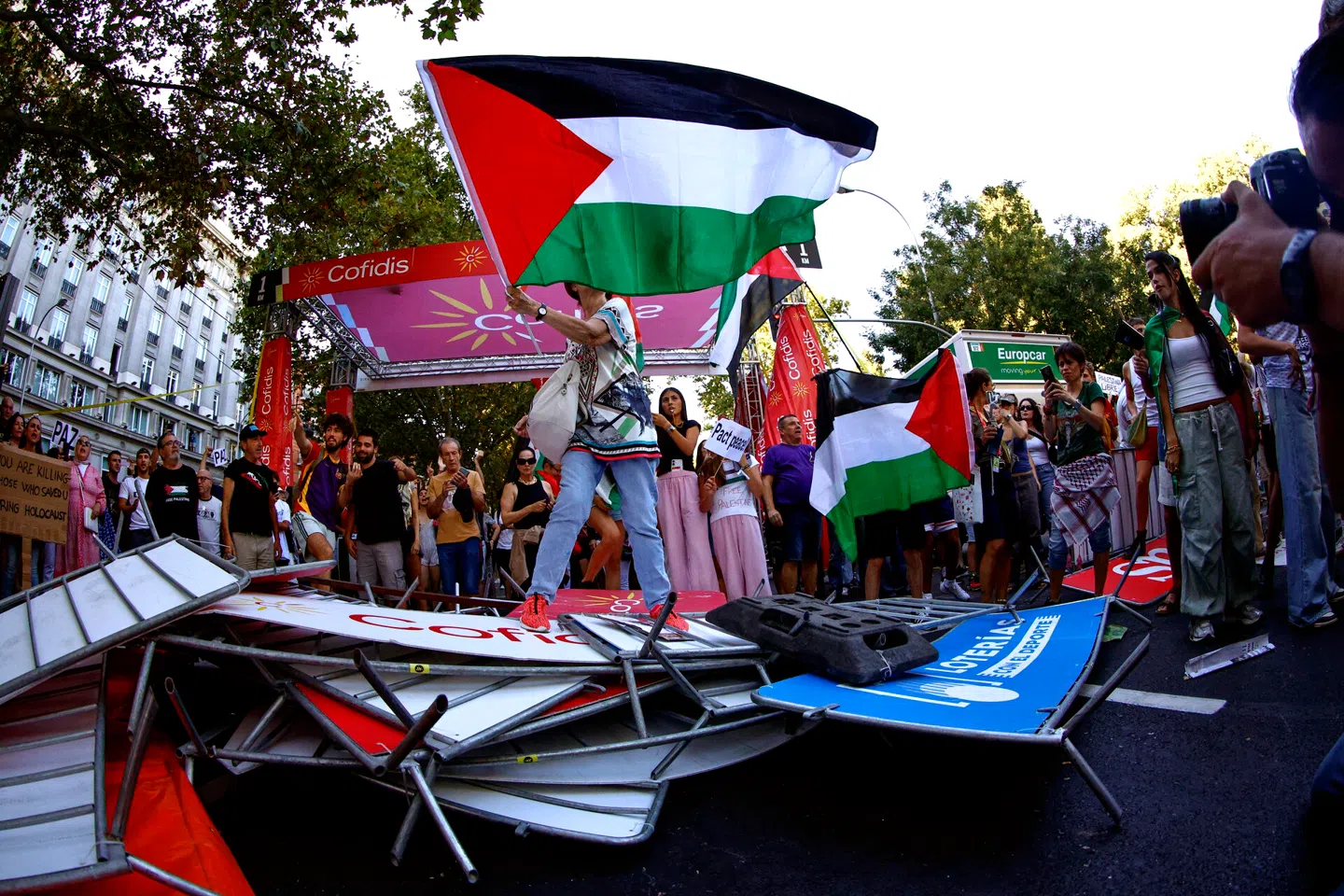 Spanien. Propalæstinensiske demonstranter har med opbakning fra den spanske regering skabt kaotiske tilstande under cykelløbet Vuelta a España. Den ulmende diplomatiske krise mellem Spanien og Israel er brudt ud i lys lue.