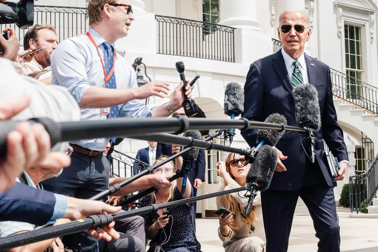 Mylderet viser sig at skyldes nogle papkasser med gratis plakater, som er revet væk, da Weekendavisen ankommer. Nu kan man se dem i hænderne på folk, som er på vej væk fra den plyndrede bod: Det er en tegning af Kamala Harris med ordet »Forward«, fremad, skrevet nedenunder.